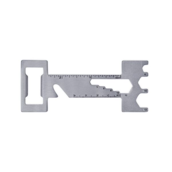 Descrição: Abridor de garrafas metálico multiferramentas, possui réguas com unidades em centímetros e polegadas, 5 chaves de boca, 3 chaves hexagonais e faca de cordão.