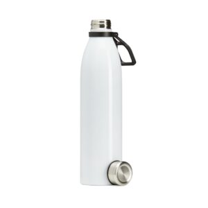 Descrição: Garrafa de inox 1,1 litros com tampa rosqueável e alça plástica para transporte.