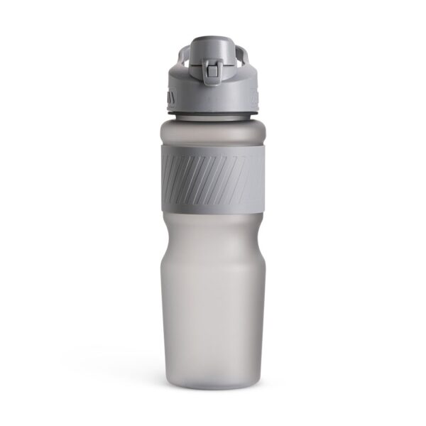 Descrição: Squeeze plástico com acabamento fosco e capacidade de até 750ml. Possui luva emborrachada, tampa rosqueável com bocal e alça fixa para transporte. O bocal conta ainda com uma tampa de proteção com trava de segurança.