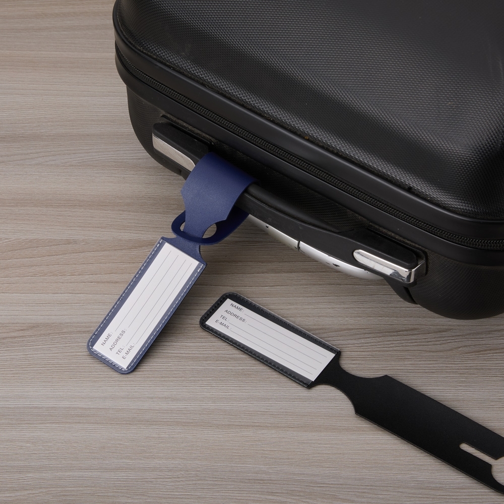 Descrição: Tag identificador de bagagem em couro sintético. Parte frontal com abertura para visor plástico e verso liso.