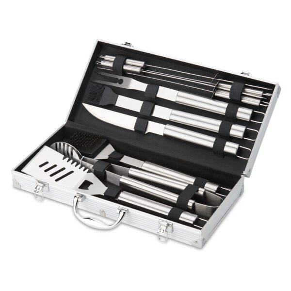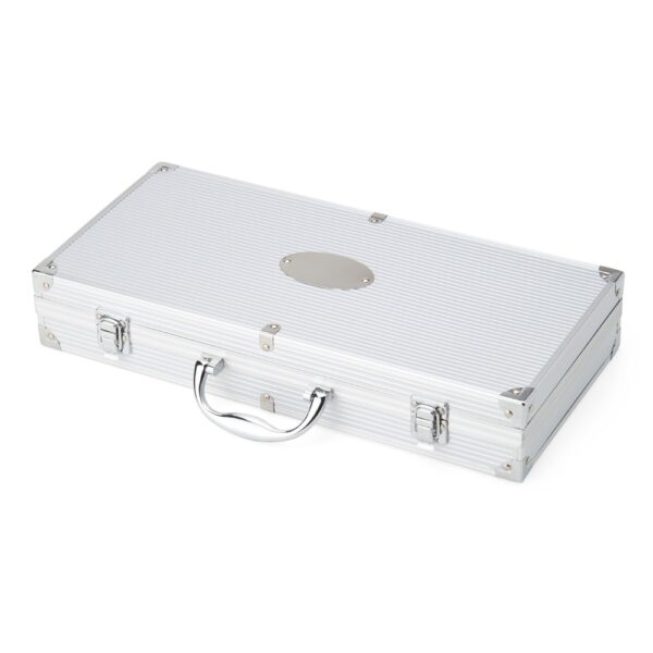 Descrição: Kit churrasco 10 peças em maleta de alumínio com travas de segurança e placa central para personalização. Contém: espátula, pegador, escova para grelha, faca, pincel, garfo e quatro espetos, parte interna da maleta com revestimento em TNT e suportes de velcro para fixação das peças.
