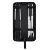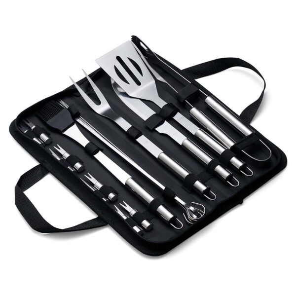 Descrição: Kit Churrasco 17 Peças em estojo de nylon com alça. Contém: pegador, garfo, espátula, faca, pincel, 4 espetos e 8 garfos pequenos para petiscos. Utensílios de inox com proteções plásticas e parte interna com velcro para fixação das peças, acompanha plaquinha metálica para personalização.