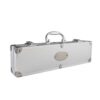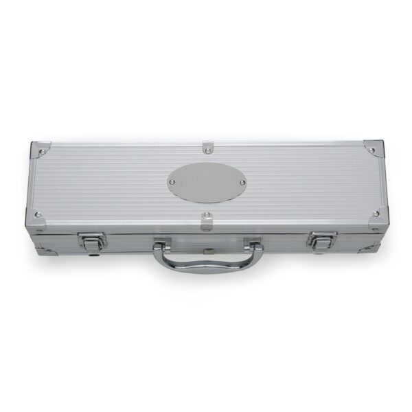 Descrição: Um kit churrasco que oferece qualidade e precisão no preparo de carnes e outros alimentos. O conjunto apresenta três peças em aço inox: um pegador, um garfo e uma faca de corte com lâmina de 6 polegadas. Além disso, os utensílios são acomodados em maleta de alumínio com revestimento interno em TNT e plaquinha para personalização.