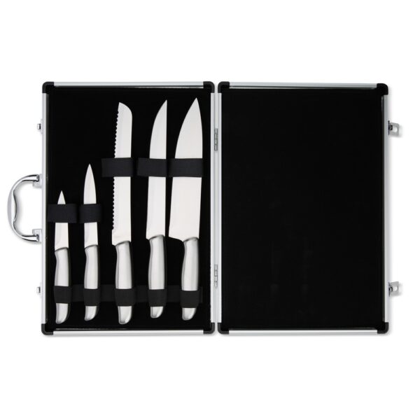 Descrição: A solução ideal para quem valoriza qualidade nos cortes e organização na cozinha. O kit inclui 5 facas em aço inoxidável, com diferentes tamanhos, perfeitas para uma experiência gourmet. Acompanha uma maleta de alumínio texturizado, com interior revestido de veludo e duas travas que garantem maior segurança. Além disso, a maleta oferece espaço para personalização, tornando o kit ainda mais exclusivo.