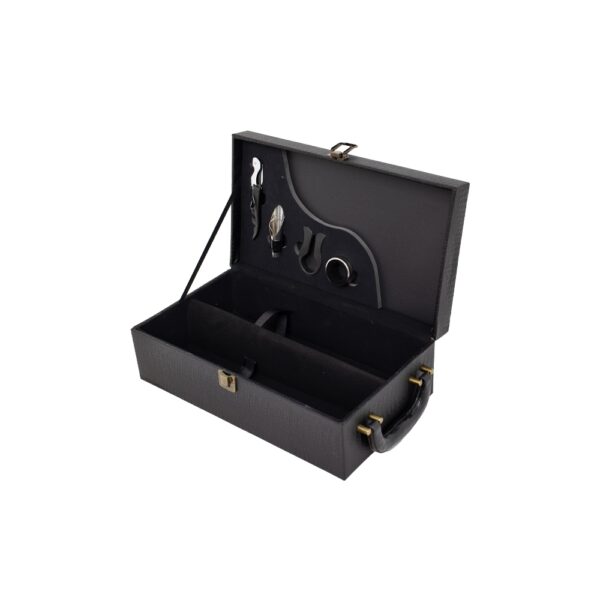 Descrição: Kit vinho 4 peças em maleta de couro sintético texturizada. Contém saca-rolhas metálico, bico condutor com tampa, cortador de lacre e wine collar. Maleta com alça, trava de segurança e plaquinha plástica fixa com fita dupla face. Área interna revestida de veludo com suportes de nylon com velcro e duas repartições para garrafas.