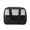 Descrição: Nécessaire em plástico transparente impermeável com detalhes em nylon e fechamento em zíper.