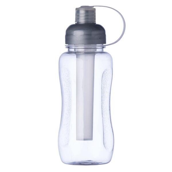 Descrição: Squeeze plástico 600ml ice bar. Squeeze colorido acinturado com detalhe retangular texturizado nas laterais, possui tampa cinza com detalhe ondulado ao redor e tampa com alça para o bico. Parte interna possui uma barra congelante(desencaixe a barra da tampa), encha a barra e coloque no congelador/freezer para gelar e depois é só colocar novamente no squeeze.