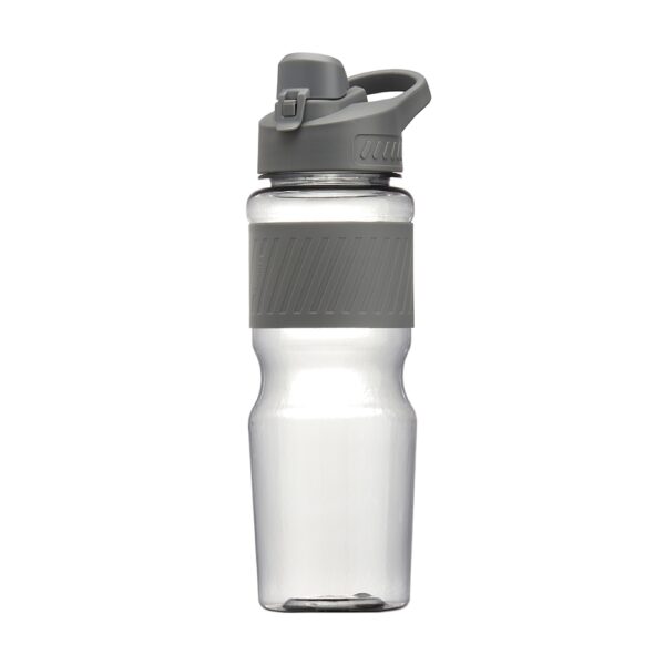 Descrição: Um squeeze plástico com capacidade de 730ml. Possui luva emborrachada para facilitar sua pegada, além de uma tampa rosqueável com bocal e alça fixa para facilitar o transporte. O bocal conta ainda com uma tampa de proteção com trava de segurança.